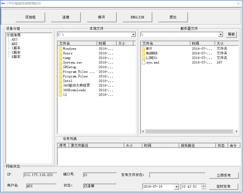 方便的終端文件管理工具,可以單臺車輛更新,可以分組更新,文件上傳到服務(wù)器,然后下發(fā)到終端,即使終端不在線也不影響下發(fā),在線后自動續(xù)傳。